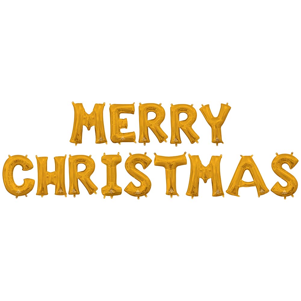 This is a Merry Christmas - Anagram Letters Kit (air-fill Only) Gold 16″ Balloons from Anagram. UPC: 721214005208 VENDOR: Anagram